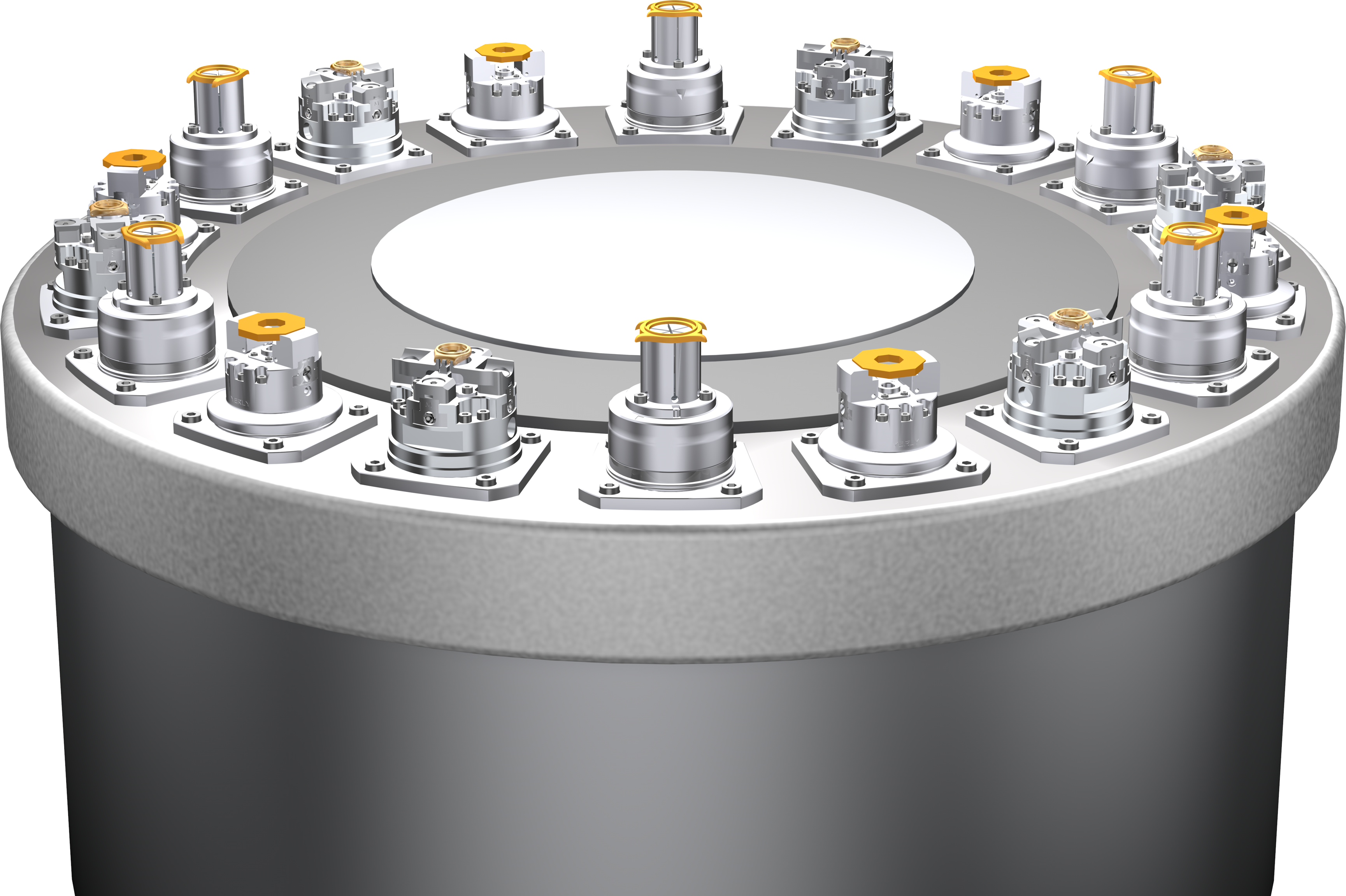 Dans l’exemple d’application ci-dessous, la machine est équipée de trois mandrins différents avec broche intégrée. La pièce reste serrée mécaniquement durant les différentes phases du processus de fabrication. La force de serrage est maîtrisée grâce à une butée réglable.